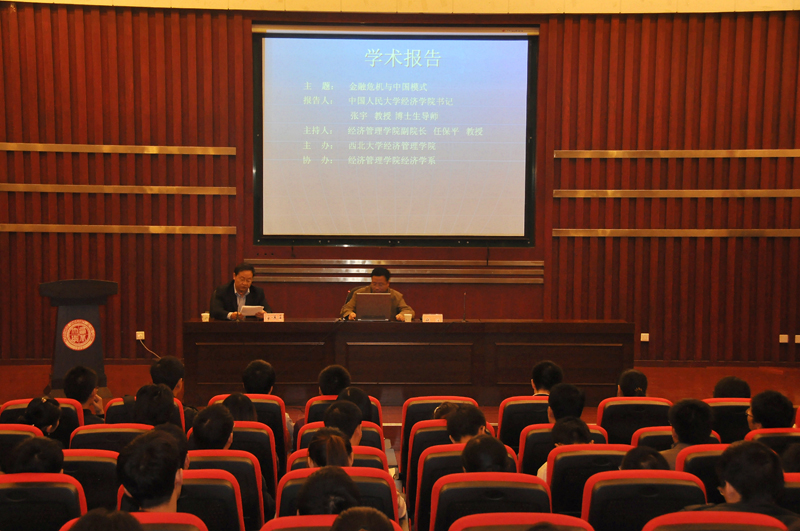 2009年10月26日晚7:00,中国人民大学经济公司党委书记、博士生导师张宇教授来公司作了一场“金融危机与中国模式”的学术报告,报告会由公司副经理任保平教授主持,公司部分教师、研究生及经济学系的本科生200多人参加。