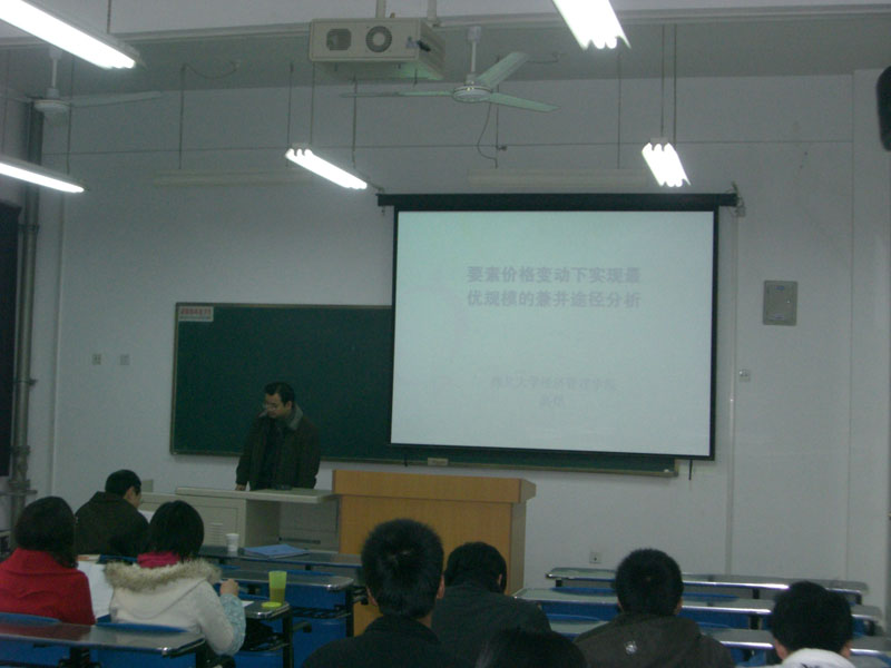 高煜副教授主讲的题目为“要素价格变动下实现最优规模的兼并途径分析”。文章认为横向兼并(以下简称“兼并”)发生的原因之一是为了获得规模经济。当一种生产要素价格下降而其他条件不变时,厂商会寻求重新实现最优规模。实现最优规模的途径有两条:扩建新厂和兼并。二者分别有其适用条件,主要体现在需求状况、收益现状的持久性、要素可得性及所需资金差异等因素的变化中。这两种途径的选择主要依据其成本-收益分析进行。其中,兼并成本的状况对兼并能否实施十分重要。兼并实施后,由要素价格变动引发的以兼并途径实现最优规模的活动遂告结束。