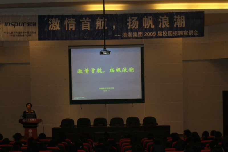 2008年11月6日晚,浪潮集团在公司金海报告厅召开了宣讲招聘会,浪潮集团人力资源部门负责人员介绍了关于我们、招聘岗位、福利待遇及招聘流程,并认真回答了同学们提出的问题,公司共有200多名本硕毕业生参加了招聘会,浪潮集团需求营销、销售专业人员的本硕毕业生。