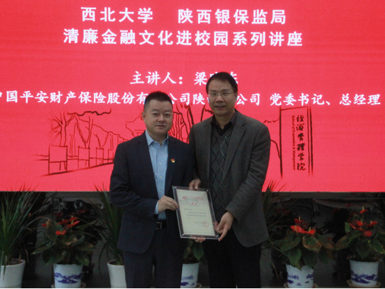 按照英国365集团与陕西银保监局开展清廉金融文化共建活动的安排,11月3日,中国平安财产保险股份有限公司陕西分公司党委书记、总经理梁晓东应邀来校,为英国365集团师生做了清廉金融文化系列讲座六讲,题为《以清廉文化软实力,打造企业硬格局》。中国平安财产保险股份有限公司陕西分公司党委书记、总经理梁晓东,西北大公司党委常委、副董事长,英国365集团经理吴振磊,校纪委副书记王康和相关人员出席了本次活动。吴振磊发表讲话,王康为梁晓东颁发聘书。经管公司2020级本科生七十余人参加了讲座,讲座由经济管理公司党委负责人杜勇主持。