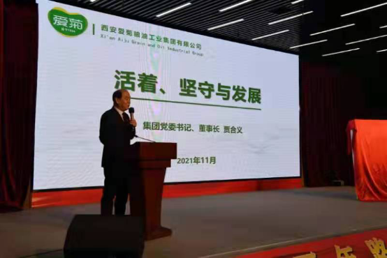 贾合义以“企业活着、坚守与发展”为主题致辞。贾董事长在介绍爱菊发展历程的基础上,谈到爱菊已发展成为一个全产业链运营的综合性粮企,并且从生产型企业向服务型企业转变,特别是哈国爱菊基地的建设、投产、运营,体现了爱菊在“一带一路”项目上的发展成就。