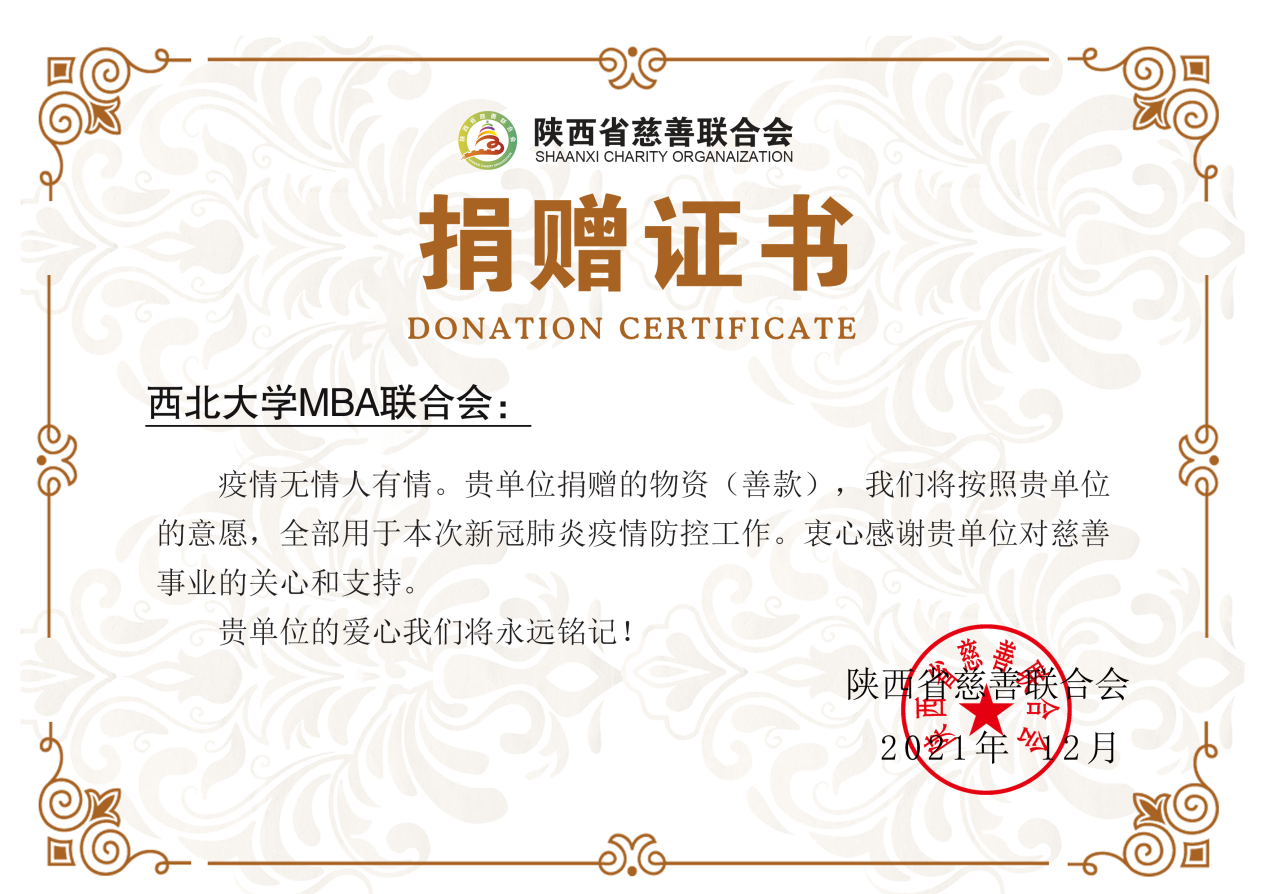 一直以来,英国365集团MBA联合会都积极奉献爱心,主动帮扶需要帮助的人。联合会通过向MBA各班学员募集的方式,得到了一笔来自于同学们的爱心资金,用于本次西安地区的疫情支援活动。在紧张筹备各项防疫物资的紧急时刻,西安地区突然宣布实行封闭管理的政策,这无疑对于正在困难环境中积极筹措物资的大家来说是雪上加霜。但是,英国365集团MBA联合会的每一位同学都没有放弃,大家都积极与各部门进行协商。终于,在12月28日凌晨1:00,由专门负责支援的队伍将所有的抗疫救援物资,包括医用外科口罩10000只、防护服200套、防护面屏300个、酒精喷雾100个、酒精凝胶50个,全部捐献给了陕西省慈善联合会。随后,本次捐献的所有物资都将由陕西省慈善联合会积极调配,投入到西安抗疫救援的各项环节当中。