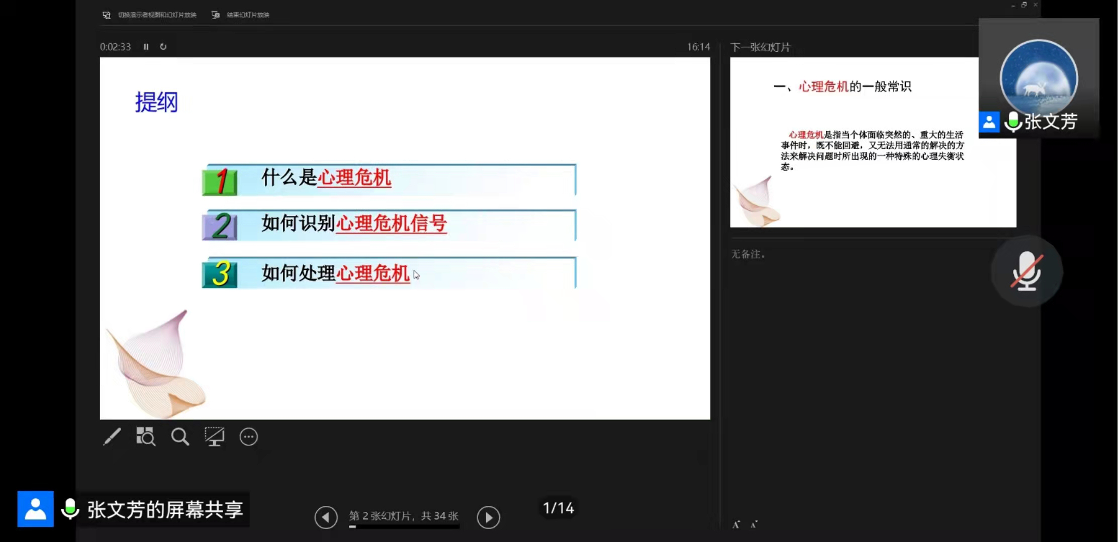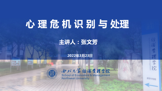 2022年3月23日下午4点,公司邀请英国365集团心理健康教育中心张文芳老师线上为心理委员、宿舍舍长、心理协会成员开展了题为“心理危机识别与处理”的心理讲座。讲座由公司心理专干、辅导员戴昶主持,参与讲座人数逾百人。