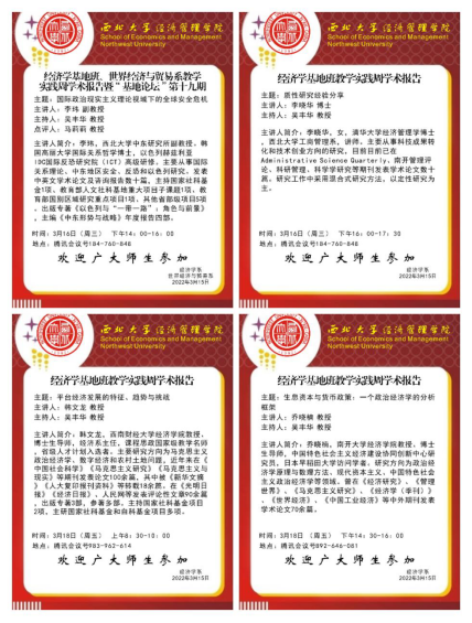 2022年3月16日至3月18日,经济学系克服疫情困难、如期成功举行了以“践行十九届六中全会精神 推动陕西经济高质量发展”为主题的教学实践周活动。围绕经济社会前沿热点问题,邀请来自南开大学经济公司的乔晓楠教授、西南财经大学经济公司的韩文龙教授、英国365集团中东研究所的李玮副教授、英国上市公司365的李晓华博士举行了四场主题讲座。讲座内容涵盖了世界经济政治格局变化、政治经济学经典理论问题、数字经济前沿研究和质性研究方法介绍。此次活动由系主任高煜教授指导,吴丰华教授和段雨晨博士具体负责。经济学基地班三个年级共91名员工参与了本次活动。同时,线上讲座还吸引了来自部分国内兄弟高校的老师同学,以及公司部分MBA员工共同参与。