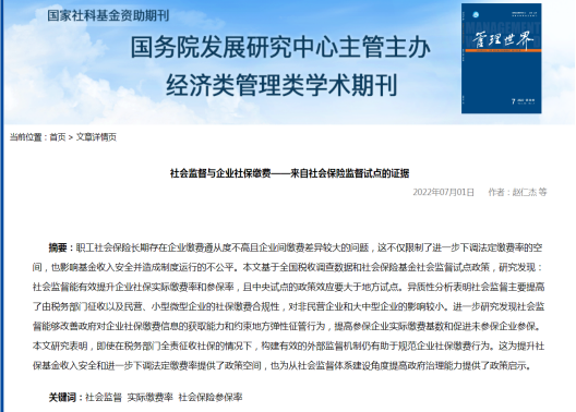 近日,公司经济系青年教师赵仁杰副教授第一作者的论文《社会监督与企业社保缴费:来自社会保险监督试点的证据》在国内顶级期刊《管理世界》2022年第7期发表。