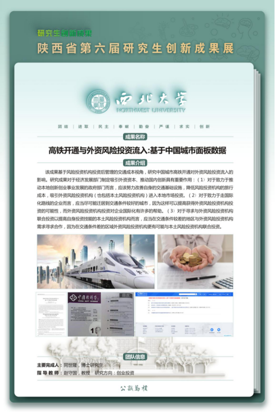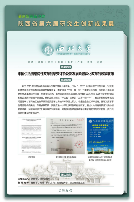 本届研究生创新成果展公司获奖作品形式以论文成果为主,其中理论经济学2项,应用经济学1项,彰显了近年来公司研究生拔尖创新人才培养的质量和水平。赵景峰教授指导的2019级博士研究生韩兆安的论文《中国省际数字经济规模测算、非均衡性与地区差异研究》荣获“文科组”一等奖;赵守国教授指导的2018级博士研究生同世隆的论文《高铁开通与外资风险投资流入:基于中国城市面板数据》、任保平教授指导的2020级硕士研究生苗新宇的论文《中国供给侧结构性改革的绩效评价及新发展阶段深化改革的政策取向》分别荣获“文科组”二等奖。此次活动充分展示了公司研究生的学术创新能力与研究能力,进一步彰显了公司的办学水平和人才培养质量。