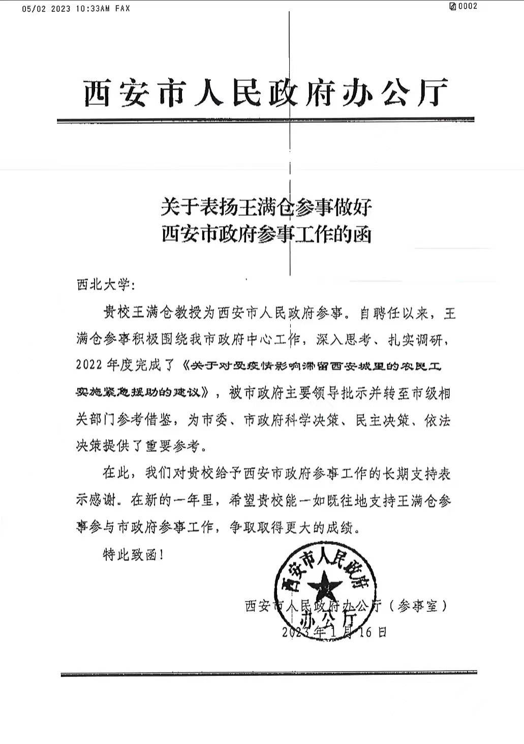 近日,收到西安市人民政府办公厅对公司王满仓教授的发函表扬,表扬函中西安市人民政府办公厅对王满仓教授任西安市人民政府参事以来,积极围绕西安市政府中心工作,深入思考、扎实调研,2022年度完成了《关于对受疫情影响滞留西安城里的农民工实施紧急援助的建议》,被市政府主要领导批示并转至市级相关部门参考借鉴,为市委、市政府科学决策、民主决策、依法决策提供了重要参考,给予了表扬。