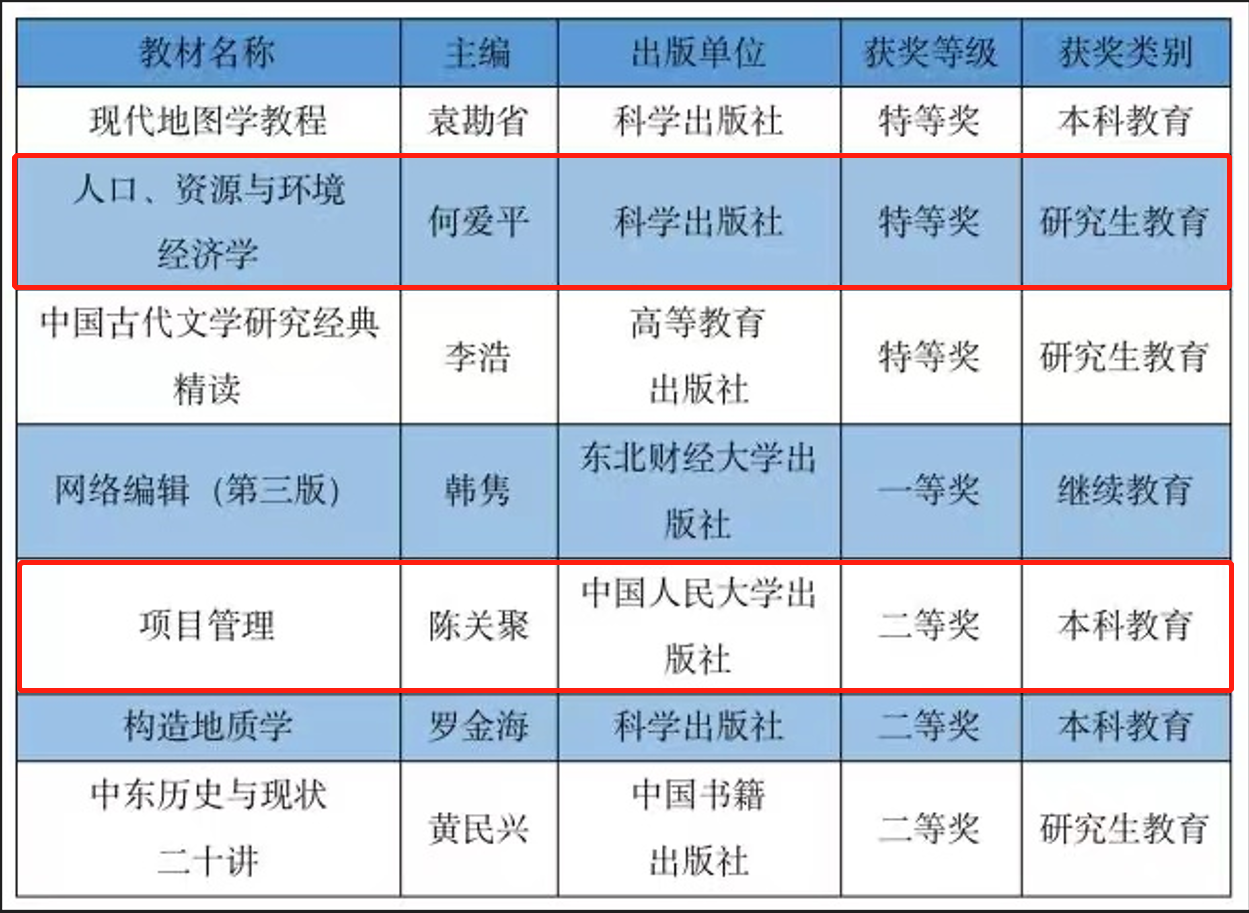 近日,陕西省2022年高等教育优秀教材奖评选结果公布,公司2部教材获奖。其中,何爱平教授主编的《人口、资源与环境经济学》荣获特等奖;陈关聚教授主编的《项目管理》荣获二等奖。