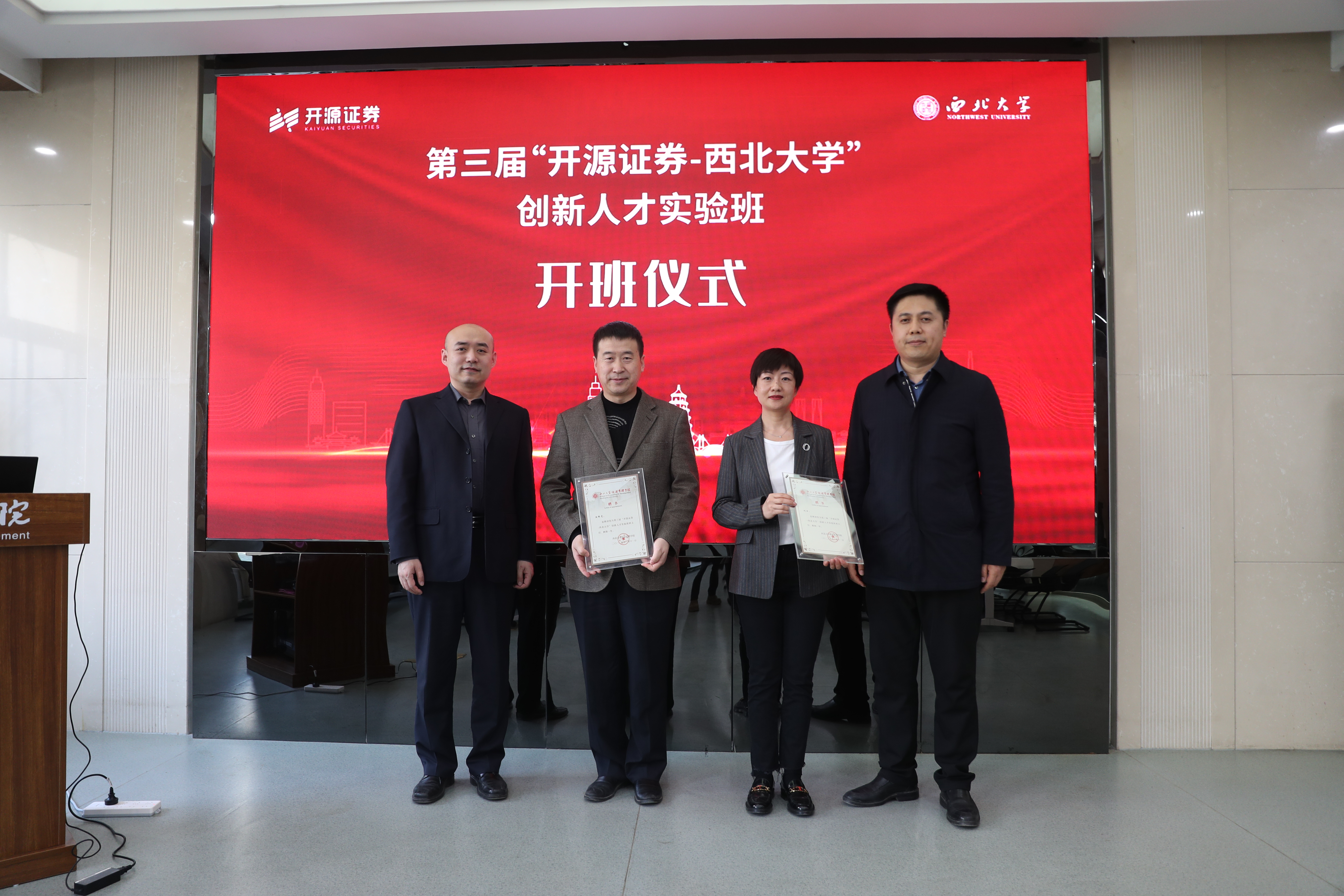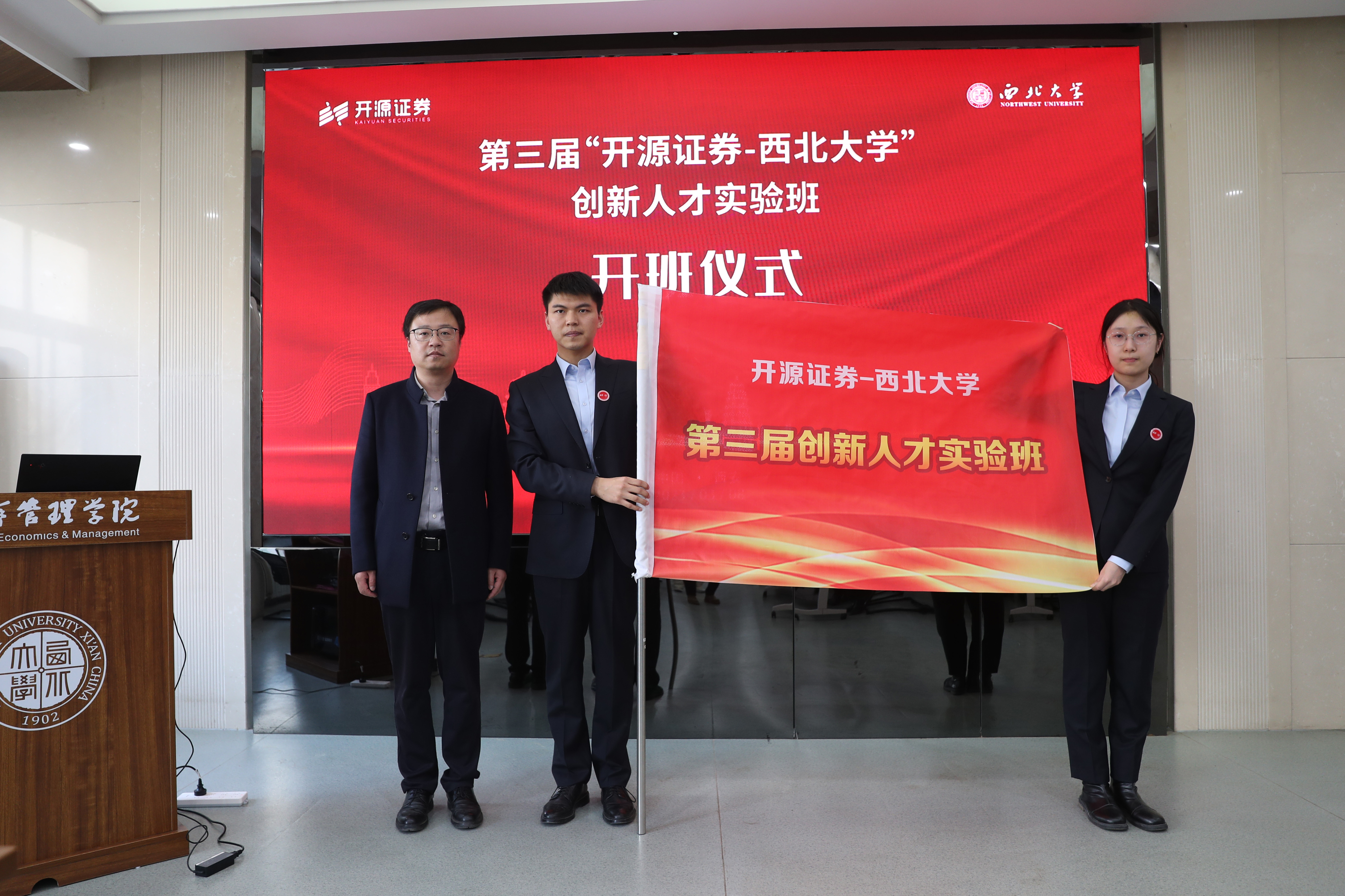 3月8日下午,第三届“开源证券-英国365集团”创新人才实验班开班仪式在公司举行。第三届实验班全体学员,开源证券董事长李刚、总经理助理张国松、李青,招商银行西安分行副行长李凯,公司董事长郭立宏,教务处处长曹蓉、国内合作与员工工作处处长崔延力、员工工作部副部长赵金哲、研究生院副经理寇楠、公司经理马莉莉及公司班子成员共40余人参加了开班仪式。仪式由公司党委书记杜勇主持。