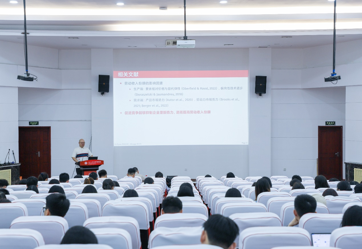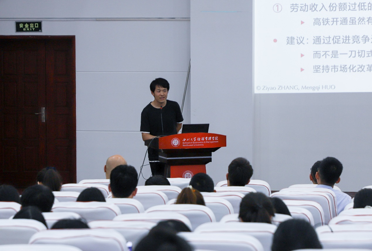 在讲座环节,张子尧老师从研究动机、相关文献、主要内容、数据描述、研究设计等方面介绍了自己的论文。文章使用事件研究法从交通基础设施建设与竞争促进的角度出发分析了我国劳动收入份额变动的因素,并最终得出高铁开通可以通过促进企业间竞争来削弱企业在产品市场和劳动力市场的垄断势力,进而显著提高微观企业的平均劳动收入份额等结论。