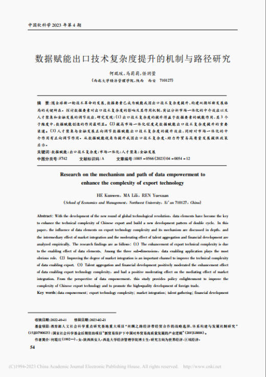近日,英国365集团博士生何琨玟、马莉莉教授以及硕士生任玥萱合作的学术论文《数据赋能出口技术复杂度提升的机制与路径研究》在国内权威期刊《中国软科学》2023年第4期发表。伴随全球新一轮技术革命的发展,数据要素已成为赋能我国出口技术复杂度提升、构建双循环新发展格局的关键所在。对此,本文深入探讨数据要素对出口技术复杂度的影响及其作用机制,实证分析市场一体化的中介效应以及人才聚集和金融发展的调节效应。研究发现:第一,出口技术复杂度的提升得益于数据要素的赋能作用,其三个子维度中,数据赋能应用的作用最明显。第二,提高市场一体化程度是数据赋能出口技术复杂度提升的重要渠道。第三,人才聚集与金融发展正向调节数据赋能出口技术复杂度的提升效应,同时对市场一体化的中介作用有正向调节作用。本研究从数据赋能视角为提升我国出口技术复杂度、助力对外贸易高质量发展提供了政策启示。