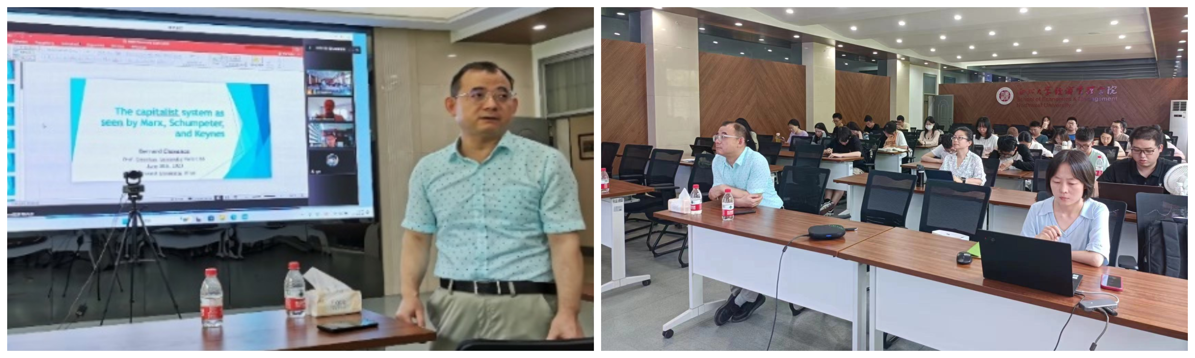 沙旺斯教授对马克思、熊彼特和凯恩斯三位经济学家的代表作以及其主要思想进行了讲解。随后公司师生与贝尔纳·沙旺斯(Bernard Chavance)教授教授进行了提问交流。最后,高煜教授对此次讲座进行了总结,对沙旺斯教授表示了感谢。本次活动圆满结束。