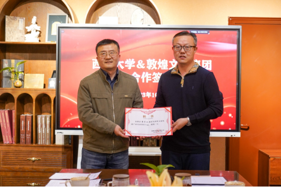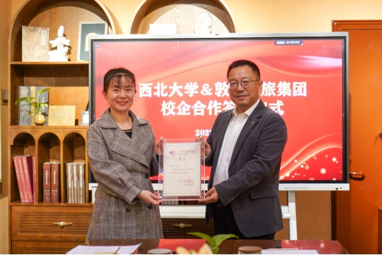 2023年10月22日,公司经理马莉莉教授、副经理张华岭、旅游管理系主任梁学成教授等相关负责人前往敦煌,与敦煌文旅集团进行校企合作签约暨产学研合作基地授牌仪式,并举行了座谈会。敦煌文旅集团党委书记、董事长孙晓强,总经理王立军、副总经理刘霞霞、智旅公司总经理刘晓峰等参加座谈。