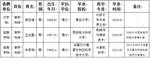 2017年6月26日上午10:00-10:40,公司在长安校区经管公司8号楼二层会议室,召开了选聘博士生试讲面试会议。面试小组由公司人事处委派的教学督导和公司相关专家组成。面试小组通过试讲、答辩及综合能力考察,结合公司近年来学科发展的重点,以及专业的需要,面试小组同意选聘以下1名博士毕业生来校任教。现将本次拟选聘人员基本情况公示如下(公示期3天):
