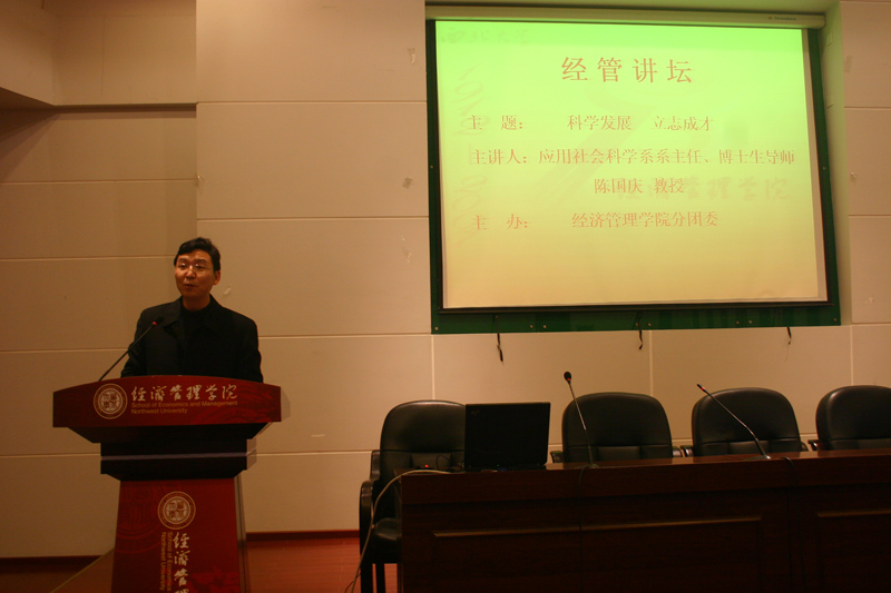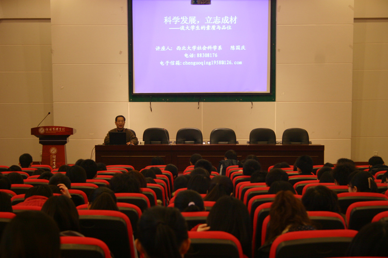 陈国庆教授以“科学发展、立志成才”为题,结合自身到美国、韩国考察、调研、交流学习心得,及对北京奥运会中国竞技体育水平的高强及中国大众体育水平低下的对比,教导同学们不但要注重科学文化知识的学习,还要重视身体素质等综合素养的全面提高,做到全面、协调、可持续发展。如何结合自身实际落实科学发展观,树立符合科学发展观要求的科学观念,陈教授教导同学们要从素质和能力的培养、训练着手。一是要注重思维素质的培养与训练,在思维素质的培养训练中要避免思维的极端化和简单化,同时还要注意培养发展变化的思维;二是要注意三个结合:注意理论和实践相结合、基本的知识要和专业的学习相结合、知识的承袭和创新相结合;三是要注重综合能力的提高,比如口头表达能力、文字表达能力、熟练使用计算机和上网的能力、熟练使用外语的能力、良好的社会交往能力、事业的拓展和开创能力;四是注重个人的修养,言谈举止、接人待物要规范礼貌。陈教授报告引经据典、深入浅出、语言诙谐幽默,报告会场掌声不断。